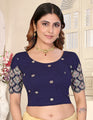 Elevate your ethnic style with this elegant Navy Blue Sequins & Embroidered Saree Blouse. The deep navy blue shade adds a sophisticated charm, while delicate sequin detailing on the body and intricately embroidered sleeves create a graceful festive look. Crafted from high-quality, stretchable fabric, this ready-to-wear blouse offers a comfortable fit with a flattering finish. Perfectly pairs with silk, georgette, chiffon, and banarasi sarees, making it an ideal choice for weddings, festive celebrations, and evening occasions..